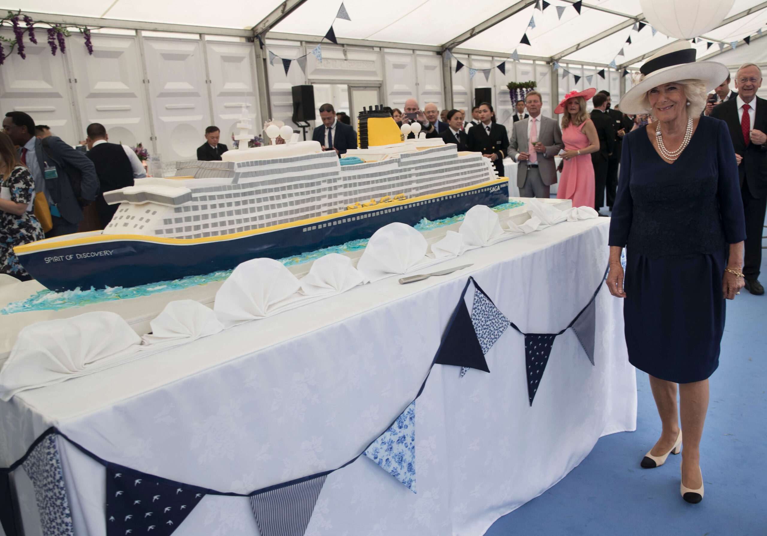 The Duchess had a short tour of the ship with Captain Julian Burgess, accompanied by Saga executives, and unveiled a plaque. She then joined around 500 guests on a quay at the garden party-themed reception where she cut a cake – a two metre replica of the ship – made by award-winning chocolatier and pastry chef Mark Tilling. When naming  the ship the Duchess made a speech to the guests and sent a jeroboam of English sparkling wine smashing against the side of the £364m ship.