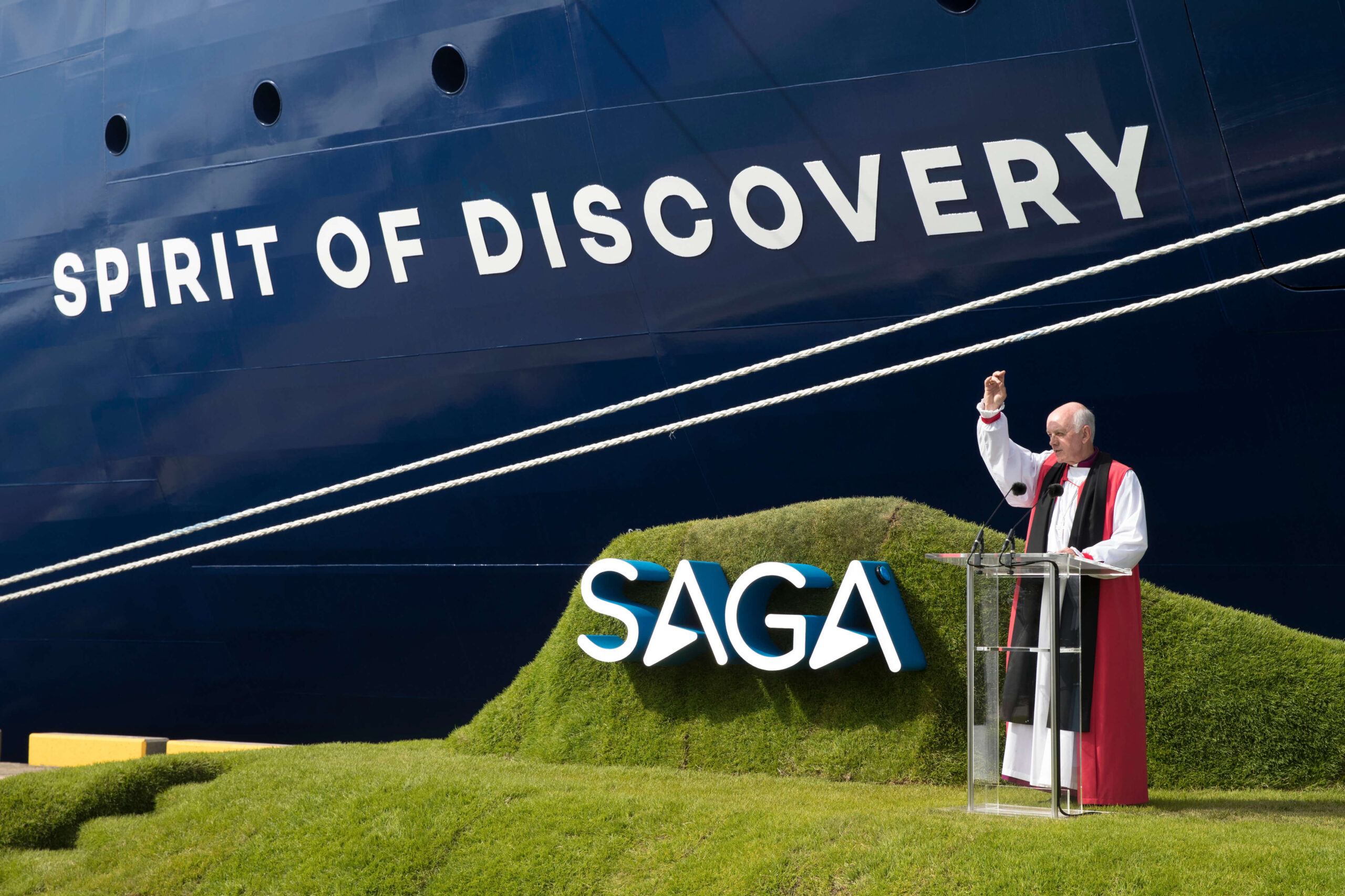 On arrival HRH was greeted by Kent Deputy Lieutenant Mr Bill Fawcus DL, representing the Lord-Lieutenant of Kent, The Viscount De L’Isle. Other dignitaries welcoming the Duchess included Patrick O’Sullivan, Chairman of Saga, and the company’s Chief Executive, Lance Batchelor. Recently retired Bishop of Dover, the Right Reverend Trevor Willmott, also took part in the blessing of the new vessel which can host 999 guests and 523 crew members. Other guests included those involved in the design and construction of the ship including the Saga cruise team, Sir Roger de Haan DL, son of company founder Sidney de Haan, and some of the firm’s customers from past cruises. The Band of Her Majesty’s Royal Marines Collingwood performed, as did the Morriston Orpheus Choir.